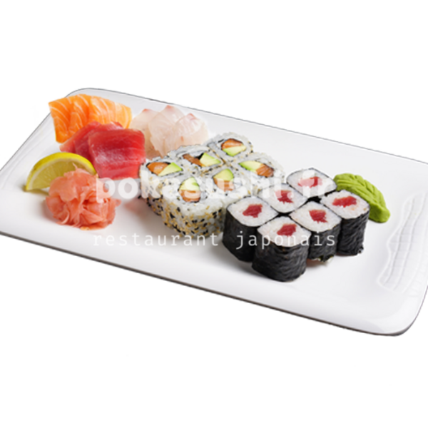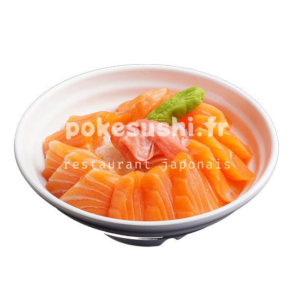 poissons cru sur un grand bol de riz vinaigré, servis avec soupe, salade; Supplément avocat🥑 + 1.50€